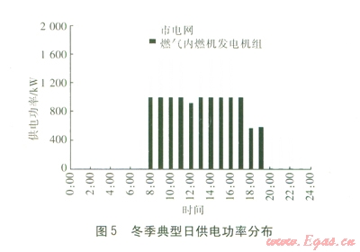 在考慮實(shí)行峰谷電價(jià)的基礎(chǔ)上,冬季典型日聯(lián)供系統(tǒng)的供電功率、供熱量、供冷量分布分別見圖5~7。