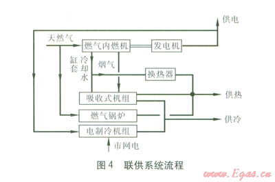由于該辦公樓規(guī)模較小,岡此聯(lián)供系統(tǒng)采用燃?xì)鈨?nèi)燃機(jī)發(fā)電機(jī)組(包括燃?xì)鈨?nèi)燃機(jī)、發(fā)電機(jī))+余熱型吸收式冷熱水機(jī)組(以下簡稱吸收式機(jī)組),聯(lián)供系統(tǒng)流程見圖4。燃?xì)鈨?nèi)燃機(jī)燃燒天然氣發(fā)電,吸收式機(jī)組利用燃?xì)鈨?nèi)燃機(jī)排放煙氣、缸套冷卻水制冷、制熱,缸套冷卻水也可以通過換熱器直接供熱,不足冷、熱量由電制冷機(jī)組、燃?xì)忮仩t補(bǔ)充。電制冷機(jī)組優(yōu)先使用聯(lián)供系統(tǒng)所發(fā)電力,不足電量由市電網(wǎng)補(bǔ)充。