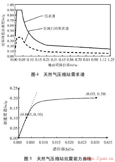 為了進一步得到該站抗震能力曲線。以圖2所示能力曲線為基本形狀,并依據(jù)HAZUS-MH對相關能力曲線參數(shù)進行設置。本例中屈服承載能力與極限承載能力兩個控制點相關參數(shù)設置如下:Cs為0.05,Te為0.35,α為0.75,γ為1.5,λ為2,μ為5。將以上參數(shù)代入能力譜控制點公式,得到該天然氣壓縮站抗震能力曲線如圖5所示。
