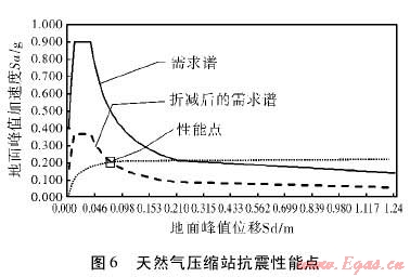 將天然氣壓縮站抗震能力曲線與需求譜繪制在同一坐標內,得到性能點,如圖6所示??梢钥闯觯阅茳c對應的地面峰值加速度約為0.2g,地面峰值加速度約為0.07m。該性能點反映了天然氣壓縮站在本次地震中所能承受的極限值。