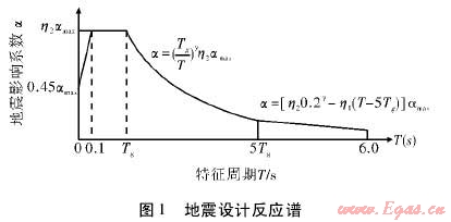 根據(jù)規(guī)范要求,采用如圖1形式的設計反應譜。反應譜相關參數(shù)設置如下:水平地震影響系數(shù)最大值為0.9,特征周期值為0.4s,建筑結構的阻尼比取0.05,地震影響系數(shù)曲線的阻尼調整系數(shù)為1.0,曲線下降段自特征周期至5倍特征周期區(qū)段的衰減指數(shù)取0.9。直線下降段自5倍特征周期至6s區(qū)段下降斜率調整系數(shù)取0.02。通過計算,得到天然氣壓縮站所在場地地震設計譜如圖3所示。以該反應譜作為該天然氣壓縮站所在場地的地震潛在危險。