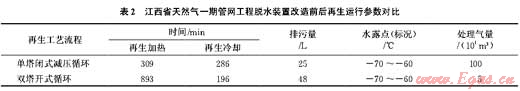 干燥器基本參數(shù)為:?jiǎn)嗡肿雍Y質(zhì)量450kg,設(shè)計(jì)處理量10000m3/h,設(shè)計(jì)吸附周期16h。為量化分析工藝改造前后生產(chǎn)參數(shù)的變化(表2),依據(jù)文獻(xiàn)[4],將國(guó)家規(guī)定標(biāo)況下壓縮天然氣的水露點(diǎn)-60℃換算成工況(3.6MPa)下的水露點(diǎn)為-30℃。