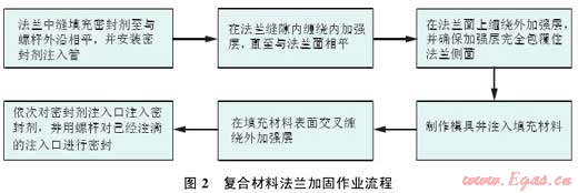 基本原理:對(duì)連接法蘭面間隙填充高強(qiáng)度堵漏密封材料,再用由高強(qiáng)度纖維與環(huán)氧粘結(jié)劑組成的復(fù)合材料對(duì)法蘭連接部位進(jìn)行整體外包覆,待復(fù)合材料結(jié)構(gòu)固化后,形成一個(gè)高強(qiáng)度殼體結(jié)構(gòu),實(shí)現(xiàn)整體加固,達(dá)到預(yù)防法蘭泄漏的目的(圖 2)。