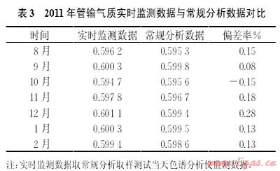 (2)在線色譜分析儀安裝投運(yùn)后,為驗(yàn)證該臺色譜儀實(shí)際運(yùn)行效果,從2011年8月開始,對色譜儀氣質(zhì)實(shí)時(shí)監(jiān)測數(shù)據(jù)和常規(guī)取樣分析數(shù)據(jù)進(jìn)行對比(表3)。從投運(yùn)7個(gè)月的天然氣相對密度對比情況來看,實(shí)時(shí)監(jiān)測數(shù)據(jù)與常規(guī)監(jiān)測數(shù)據(jù)最大偏差出現(xiàn)在12月,為0.28%,其余月份偏差較小。除儀器固有分析誤差和常規(guī)分析時(shí)產(chǎn)生的泄漏等人為或器械故障原因?qū)е鲁霈F(xiàn)不可克服的分析偏差外,色譜儀實(shí)時(shí)監(jiān)測數(shù)據(jù)運(yùn)行總體保持平穩(wěn)。根據(jù)實(shí)時(shí)監(jiān)測數(shù)據(jù)變動(dòng)情況可知,10月初因下游用氣需求發(fā)生較大變化,期間壓減了某一氣源的日接氣量,導(dǎo)致相對密度變化較大。此時(shí)如果采用常規(guī)分析檢測手段將無法實(shí)時(shí)反映這種氣質(zhì)變化,從而導(dǎo)致產(chǎn)生較大計(jì)量偏差。而安裝在線色譜儀后,可以實(shí)時(shí)采集到管道內(nèi)的最新氣體組分,便于在上游進(jìn)行流程切換時(shí),及時(shí)掌握氣質(zhì)變化情況,提高了計(jì)量精度[3]。