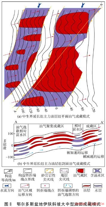低幅度構(gòu)造的發(fā)育為伊陜斜坡上油氣的逸散或富集提供了必要條件。低幅度構(gòu)造局部產(chǎn)狀的陡緩變化影響運移通道中油氣沿斜坡上傾方向的運移動力、運移速度及運移方向,從而導(dǎo)致油氣運移途中發(fā)生局部或較大區(qū)域的逸散或富集,控制油氣水在空間上的分異與分布,形成相對的油氣富集區(qū)及含水較高的含油水區(qū),通常前者發(fā)育于低幅度構(gòu)造的高部位,后者則處于諸如鼻凹等低幅度構(gòu)造的較低部位或較大規(guī)模鼻褶群帶間的低洼分隔區(qū)。低幅度構(gòu)造坡折帶轉(zhuǎn)折端端點連線與沉積相帶邊側(cè)部的巖性/物性尖滅線及局部的地層尖滅線等界線組合可形成巖性-構(gòu)造、構(gòu)造-巖性、地層-構(gòu)造等復(fù)合圈閉以及較大的圈閉空間,有效地阻滯、封堵油氣運移,并截留、捕獲過路油氣,進而聚集形成油氣藏。繼承性發(fā)育的低幅度構(gòu)造與多期次沉積的儲集層疊合,促成了垂向上多層系油(氣)藏的復(fù)合發(fā)育。低幅度構(gòu)造與大型沉積體系及其有利相帶等條件組成優(yōu)勢配置,控制了伊陜斜坡內(nèi)中生界乃至古生界主要的油氣分布,奠定了盆地大面積成藏及大中型油氣田發(fā)育的地質(zhì)基礎(chǔ)。