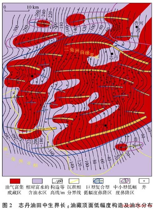 通常情況下,低幅度構(gòu)造高部位及其組合而成的更大規(guī)模的鼻狀褶皺帶或者大型的低幅度隆起發(fā)育區(qū)必然成為油氣運移的主要指向區(qū)和油氣富集成藏的主要場所,而較低的鼻凹部位或較大規(guī)模鼻褶群帶間的低洼分隔區(qū)域則隨著油氣的相對逸散而成為含水飽和度較高的含油水區(qū)或天然的泄水區(qū)(見圖8)。在大中型復(fù)合低幅度構(gòu)造中,局部鼻凹的負(fù)向?qū)傩酝ǔ伙@著弱化,因而可以成為有效的油氣捕集單元。陜北腹地的志丹油田即是一個受基底控制、由復(fù)合型鼻褶構(gòu)造組合而成的大型低幅度隆起發(fā)育區(qū),油田總面積約3500km2,其中油氣的富集成藏區(qū)域與低幅度構(gòu)造發(fā)育情況及沉積相帶展布密切相關(guān),而含油水區(qū)則主要分布于局部的構(gòu)造低洼分隔區(qū)以及沉積相帶的邊側(cè)部(見圖2)。