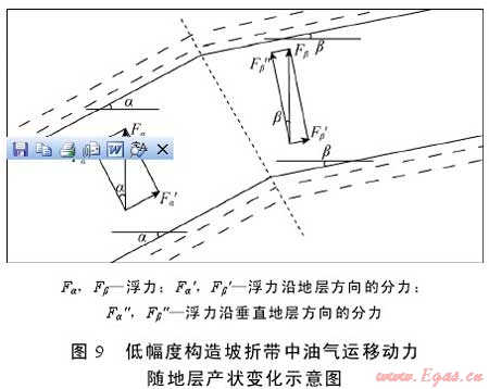 低幅度構(gòu)造為油氣的逸散或富集提供了必要條件。伊陜斜坡整體為平緩的西傾單斜,地層傾角約1°,但大單斜的內(nèi)部發(fā)育大量各種類型的低幅度構(gòu)造,鼻狀構(gòu)造是其基本的構(gòu)成單元,其斷面形態(tài)呈現(xiàn)出連續(xù)和反復(fù)的具一定起伏的坡折特性。在鼻狀構(gòu)造的翼部,地層變陡,傾角比正常情況下增大3°~5°甚至更大;在鼻狀構(gòu)造的高端部位或低洼處,地層轉(zhuǎn)趨平緩,傾角比正常情況減小1°~2°甚至更大角度(見圖8)。根據(jù)油氣運移理論,在水條件下,浮力是油氣二次運移最主要的動力[27]。對于鄂爾多斯盆地中生界特低滲—超低滲致密砂巖儲集層而言,浮力對油氣二次運移更為關(guān)鍵,其他動力如水動力等作用極小。如果地層傾斜且其上為蓋層所封閉,當(dāng)油氣上浮到儲集層頂面時,在浮力作用下油氣必沿其上傾方向繼續(xù)運移;浮力沿地層方向分力的大小不僅與地層水密度有關(guān),還與地層的傾角有關(guān)[27]。如果低幅度構(gòu)造翼部地層傾角為α,至構(gòu)造高端轉(zhuǎn)變?yōu)?beta;(見圖9),則油氣的上浮分力會相應(yīng)地增大或減小(如公式(1)、(2)所示)。因此,低幅度構(gòu)造坡折帶地層產(chǎn)狀的陡緩變化影響運移通道中油氣沿斜坡上傾方向的運移動力、速度及方向等,使得油氣在局部區(qū)間或減速滯留聚集成藏或加速擴散。