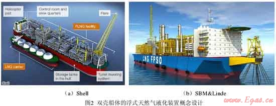 最初,FLNG 概念設(shè)計采用混凝土制造船體,在其上放置球形、圓柱形或薄膜型 LNG 儲艙?;炷翚んw吃水深,承載能力大,具有低溫性能好、不易老化的優(yōu)點,但是這種結(jié)構(gòu)的船身笨重,遷移和錨泊將是巨大的挑戰(zhàn)。代表性的 FLNG 概念設(shè)計有:Mobil 公司的 Floating LNG 和 Bouygues Offshore 公司的 Azure項目(圖1)。