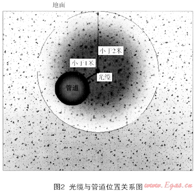 受當(dāng)前儀器設(shè)備精度所限,只能分析出光纖橫截面為中心半徑2m內(nèi)振動(dòng)聲音信號。即,光纜有效監(jiān)測半徑只有2m,所以,管道必須完全處在光纜為中心2m包絡(luò)線之內(nèi),否則將有部分管體受不到有效保護(hù)(如圖2)。