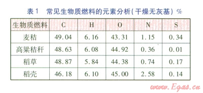 常見生物質(zhì)燃料的元素分析(干燥無灰基)見表1。由表1可知,生物質(zhì)燃料含碳量較少,質(zhì)量分?jǐn)?shù)一般小于50%,因此生物質(zhì)燃料不耐燒,發(fā)熱量較低。生物質(zhì)燃料含硫量很低,質(zhì)量分?jǐn)?shù)大多低于0.20%,甚至為零,因此燃用生物質(zhì)燃料的燃燒設(shè)備不必設(shè)置脫硫裝置,以降低設(shè)備造價。