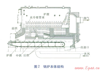 后拱的設(shè)計應(yīng)使火床的強(qiáng)烈燃燒區(qū)處于后拱的拱區(qū)內(nèi),并具有足夠的覆蓋率、容積高度,其長度和高度比燃煤鍋爐有所增加,后拱出口應(yīng)有一個水平或向下的拱段。