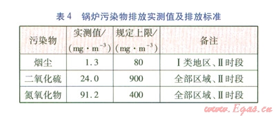 經(jīng)環(huán)保部門檢測,鍋爐污染物排放實(shí)測值及規(guī)定上限見表4。執(zhí)行標(biāo)準(zhǔn)為GB l3271-2001《鍋爐大氣污染物排放標(biāo)準(zhǔn)》。由表4可知,各項(xiàng)污染物排放指標(biāo)符合要求。