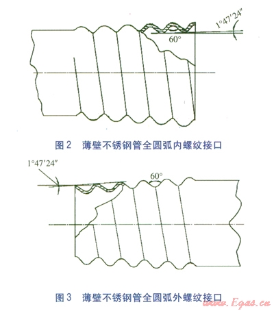 GB 50028-2006認可了薄壁不銹鋼管的卡套式連接,CJJ 94-2009認可了卡套式、卡壓式、環(huán)壓式3種機械連接。目前在燃氣行業(yè)中,卡壓式連接使用比較廣泛。GB/T l9228.1-2011《不銹鋼卡壓式管件組件》明確了卡壓式連接所應達到的技術性能,GB/T 3765-2008《卡套式管接頭技術條件》則明確了卡套式連接所需達到的技術條件。因此,我們認為,如果全圓弧螺紋接口的連接性能能夠達到卡壓式或卡套式連接的性能要求,則應該能夠在城鎮(zhèn)燃氣室內管道中應用。