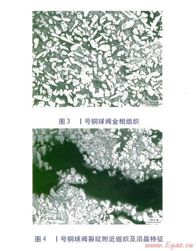 對I號、Ⅱ號銅球閥的金相組織[1]及裂紋進(jìn)行分析,結(jié)果如下:
