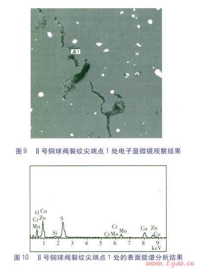 對Ⅱ號銅球閥裂口尖端處的灰色物質(zhì)試樣進(jìn)行掃描電子顯微鏡觀察,結(jié)果表明:裂紋表面可見明顯灰色覆蓋物。能譜分析結(jié)果表明主要成分為Cu、Zn、S、O和少量Cr、Mn等,Ⅱ號銅球閥裂紋尖端點(diǎn)l處的電子顯微鏡觀察結(jié)果和表面能譜分析結(jié)果見圖9、10。