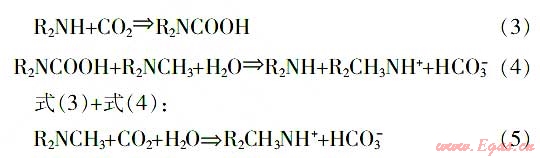式(2)為瞬間可逆反應(yīng),而式(1)受液膜控制,反應(yīng)速率極慢,為控制步驟。為加快反應(yīng)速率,可向MDEA溶液中加入伯醇胺或仲醇胺,它們可與CO2快速反應(yīng)生成氨基甲酸酯,進(jìn)而激活MDEA,提高與CO2的反應(yīng)速率。目前較為認(rèn)可的反應(yīng)機理是穿梭傳遞,即伯醇胺或仲醇胺在界面和液相本體間穿梭傳遞CO2。以仲醇胺為例,在MDEA溶液中加人R2NH后,反應(yīng)按式(3)~(4)進(jìn)行: