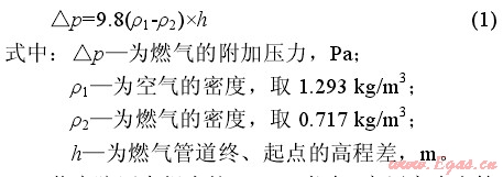 民用天然氣燃具的額定壓力pn=2000Pa,燃具前壓力應(yīng)在(0.75~1.5)pn范圍內(nèi)波動(dòng)(參見《城鎮(zhèn)燃?xì)庠O(shè)計(jì)規(guī)范》(GB50028—2006))。當(dāng)天然氣壓力超出此范圍,燃具的熱效率降低,燃燒不穩(wěn)定,燃燒噪聲大,出現(xiàn)脫火或者回火等現(xiàn)象。目前,安陽市高層建筑的燃?xì)庠O(shè)計(jì)主要采用低壓入戶,在計(jì)算低壓燃?xì)夤艿赖膲毫p失時(shí),應(yīng)考慮因建筑高度而引起的燃?xì)飧郊訅毫Α?/span>p,計(jì)算如下: