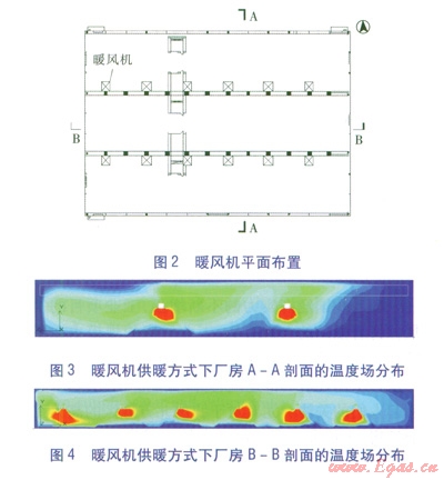 采用安裝在廠房高空的暖風機,將熱風送至工區(qū),改善工作區(qū)的熱環(huán)境。暖風機的安裝高度范圍為4~30 m,單機額定供熱量范圍為20~120 kW.單機輻射面積范圍為500~1