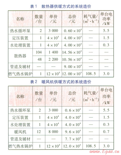 系統(tǒng)造價主要包括設備費、材料費、各項增容費,由于廠區(qū)內(nèi)已具備各類條件,故不考慮增容費。3種供暖方式的系統(tǒng)造價分別見表l~3。散熱器供暖方式的系統(tǒng)造價為54.72×104元,暖風機供暖方式的系統(tǒng)造價為37.9×104元,燃氣紅外線輻射供暖方式的系統(tǒng)造價為34×104元。