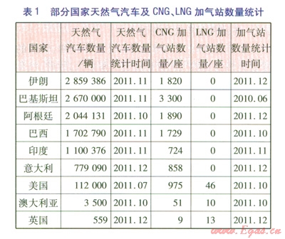 由表l可以看出,伊朗、巴基斯坦、阿根廷、巴西、印度和意大利等幾個(gè)國(guó)家的天然氣汽車擁有量接近世界天然氣汽車總量的80%,且全部采用CNG汽車。通過(guò)表l中CNG加氣站與LNG加氣站數(shù)量對(duì)比,可以判斷,世界范圍內(nèi)LNG汽車數(shù)量遠(yuǎn)遠(yuǎn)小于CNG汽車數(shù)量,車用LNG處于起步階段。
