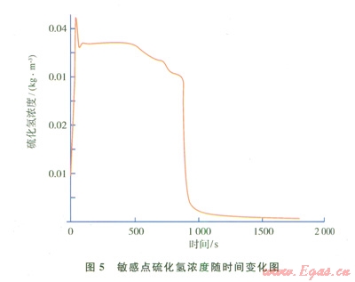 對于含硫天然氣擴(kuò)散引起的風(fēng)險,需要計算特定位置硫化氫含量的變化情況,即各網(wǎng)格點(diǎn)或敏感目標(biāo)處硫化氫含量隨時間變化情況。分別以某井場井噴和某天然氣凈化裝置事故為例,得到事故發(fā)生時硫化氫的時空分布情況(圖2~5)。