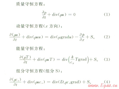 CFD可以看作是在流動基本方程(質(zhì)量守恒方程、動量守恒方程、能量守恒方程)控制下對流動數(shù)值的模擬。通過這種數(shù)值模擬,可以得到極其復(fù)雜問題的流場內(nèi)各個位置上基本物理量(如速度、壓力、溫度、濃度等)的分布,以及這些物理量隨時間的變化情況。由于含硫天然氣是混合物質(zhì),因此,控制方程還應(yīng)包括組分守恒方程。4個方程的表達(dá)式如下。