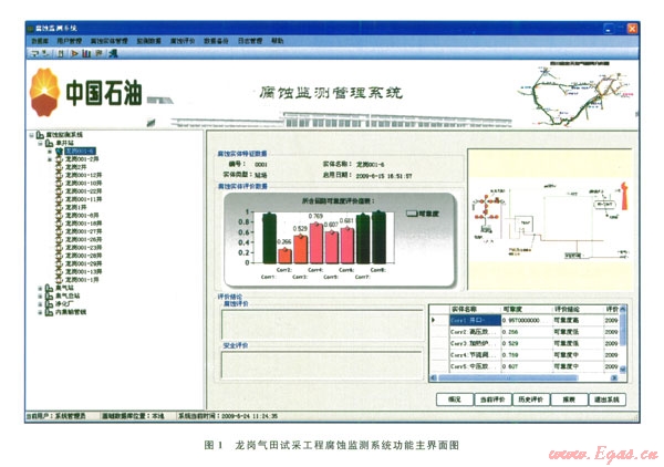 圖l為龍崗氣田試采工程腐蝕監(jiān)測系統(tǒng)功能主界面圖,通過中間數據庫實現與龍崗氣田數字化巡檢系統(tǒng)和三維地理信息系統(tǒng)的數據交互,實現腐蝕數據的圖形展示,為管理者提供決策依據。