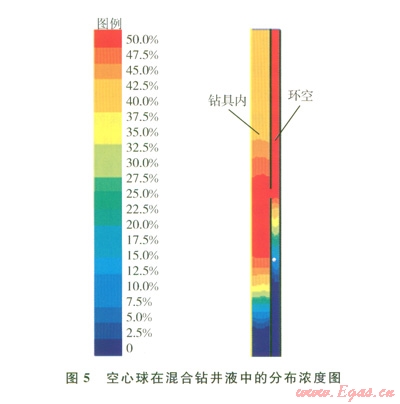 泵入的空心球與鉆井液混合流體中空心球的含量為40%,經(jīng)過(guò)分離后,大部分空心球由于密度的差異和環(huán)空流動(dòng)的影響進(jìn)入環(huán)空,環(huán)空分離點(diǎn)以上空心球體積達(dá)到50%,分離點(diǎn)以下僅有少量的空心球(小于2%)未實(shí)現(xiàn)有效分離。如圖5所示,空心球在注入點(diǎn)以上環(huán)空內(nèi)分布均勻,能夠有效降低環(huán)空分離點(diǎn)以上鉆井液的密度,實(shí)現(xiàn)多梯度鉆井技術(shù)。