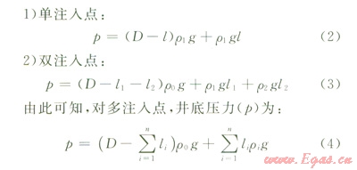 根據(jù)鉆井實(shí)際的需要可以設(shè)置一個(gè)或多個(gè)注入點(diǎn),這些注入點(diǎn)位置可以固定,也可以隨鉆柱移動(dòng)而移動(dòng)。井底壓力(p)為: