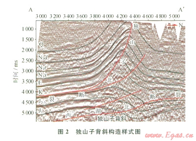 圖2顯示了獨山子北斷裂沿白堊系吐谷魯群泥巖層滑脫,向上突破進入古近系地層,控制了獨山子背斜斷層傳播褶皺的發(fā)育。獨山子背斜中淺層為典型的斷層傳播褶皺。其特點為:①背斜后翼模擬下盤斷坡產(chǎn)狀;②形成向斷層運動方向傾倒的不對稱背斜;③常有突破斷層發(fā)育;④突破斷層位移量很小[4]。