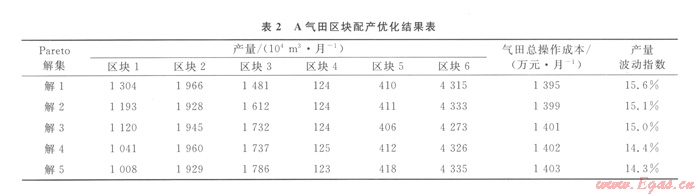 表2給出模型的Pareto解集,該解集包含5個(gè)Pareto解,這5個(gè)解滿足約束條件,總操作成本介于1 395~1 403萬(wàn)元/月,產(chǎn)量波動(dòng)指數(shù)在14.3~15.6范圍內(nèi),均優(yōu)于按同比例增長(zhǎng)方案。決策者可以根據(jù)各區(qū)塊實(shí)際情況,在上述解中選取一組進(jìn)行調(diào)峰配產(chǎn)。
