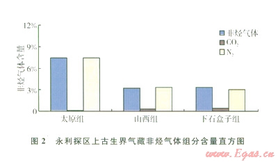 本區(qū)上古生界天然氣中含量最高的非烴氣體為氮氣,含量一般在3%以上。太原組天然氣組分中氮氣含量為7.36%;山西組氣藏中氮氣含量有所降低,分布范圍為2.15%~3.41%,均值為2.88%;下石盒子組氮氣含量與下部的山西組氣藏相近,均值為3.Ol%(表1、圖2)。這一分布特征與區(qū)塊北部的天環(huán)北段和橫山堡氣田的天然氣中氮氣含量近似,要高于榆林、神木、米脂等氣田。由此可見,構造活動較為強烈的西緣逆沖帶為整個鄂爾多斯盆地氮氣含量相對較高的區(qū)域。這一現(xiàn)象說明天然氣中氮氣含量的增加主要與氣藏的保存條件有關,但也可能有深大斷裂造就的深源氮氣的貢獻。