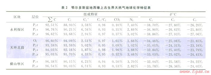 研究區(qū)氣藏除了來自本區(qū)山西組-羊虎溝組太原組煤系烴源巖的自生自儲型氣源外,也有可能接受東側天環(huán)向斜早期的側向供烴。天環(huán)向斜北部二疊系下部(山西組、太原組)和石炭系羊虎溝組有效烴源巖的目前的成熟度為I.35%~2.0%,區(qū)域資料證實其在西緣構造定型之前與西緣的源巖演化較為一致,西緣構造隆升除了可以接受本區(qū)下部烴源巖的垂向供烴外,也可以接受天環(huán)向斜的側向供烴。另外,研究區(qū)天然氣組分特征及輕烴同位素特征與天環(huán)北段有一定的相似性(表2),表明其有可能是同源的天然氣,因而不能排除天環(huán)向斜為其來源之一。