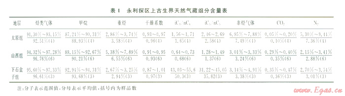 1)永利探區(qū)上古生界氣藏天然氣組分以烴類氣體為主,甲烷為烴類氣體的主要組分,其含量多超過90%,非烴氣體以氮氣為主,極少量為二氧化碳;氣藏的重烴含量不高,干燥系數(shù)較高,氣藏總體上偏干,下石盒子組天然氣曾經經歷過較明顯的分餾作用。