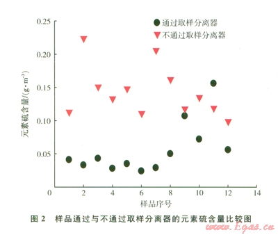 同時,為避免水和顆粒物等對井口取樣準(zhǔn)確性的影響,常規(guī)天然氣分析常會采用取樣分離器。但從試驗研究結(jié)果來看,樣品通過取樣分離器取樣測定的元素硫含量低于樣品不通過取樣分離器取樣測定的元素硫含量(圖2)。岡此,元素硫取樣方案中應(yīng)明確提出采用樣品不通過取樣分離器方式進(jìn)行取樣,這是準(zhǔn)確測定元素硫含量的關(guān)鍵環(huán)節(jié)。