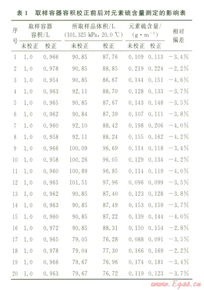 為了保證取樣時取樣容器中不含影響測定準(zhǔn)確性的水和氧氣等干擾物,在取樣前對容器進(jìn)行干燥和無氧化處理是非常重要的。同時由于計算元素硫含量時,需要掌握樣品在標(biāo)準(zhǔn)參比條件(我國為101.325kPa,20.0℃)下的體積。而天然氣樣品是采集在壓力下的取樣容器中的,當(dāng)已知取樣容器的容積、樣品的壓力和氣體在壓力下的壓縮岡子,根據(jù)氣體狀態(tài)方程,可計算天然氣樣品在標(biāo)準(zhǔn)參比條件下的體積。因此,如何準(zhǔn)確測定取樣容器的容積是實施測定前必須考慮的關(guān)鍵因素之一。表l為取樣容器進(jìn)行容積校正前后對元素硫測定結(jié)果的影響程度。可以看出,取樣容器未校正元素硫含量值比校正元素硫含量值低2%~5%。