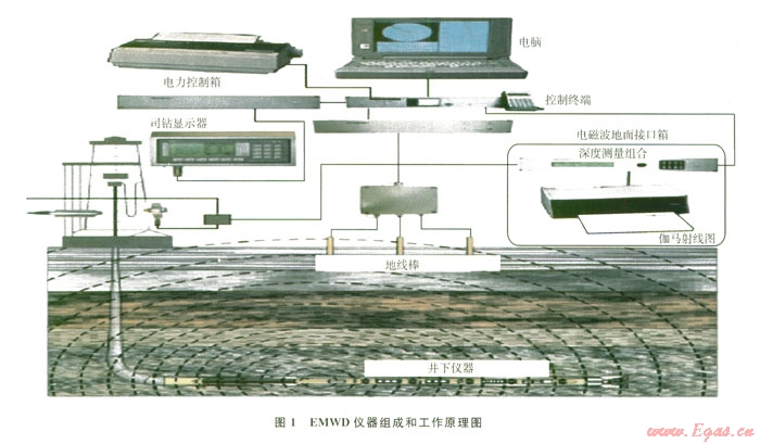 EMWD主要由地面儀器和井下儀器組成(圖1):①地面儀器主要由電腦和相匹配的工作軟件、電磁波地面接口箱、地線棒、防噴器連接器、同軸電纜、司鉆顯示器、司鉆顯示器電纜等組成;②井下儀器從上到下依次南電磁波短節(jié)、發(fā)射天線、脈沖電路、電磁波電池、流量開關(guān)、定向電池和定向探管組成。