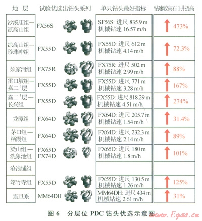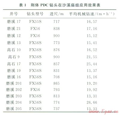 通過試驗與優(yōu)化改進PDC鉆頭,逐步優(yōu)選出適應各層位的PDC鉆頭型號(圖6),機械鉆速和單只鉆頭進尺大幅度提高,第二批正鉆井在沙溪廟地層試驗剛體PDC鉆頭取得新進展,平均機械鉆速由傳統(tǒng)胎體PDC鉆頭7.24m/h提高到16.27m/h(表1),已接近空氣鉆進效果。