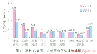 海相地層占全井進尺的57%(約3000m),巖石強度高,硅質含量重,部分層段含燧石結核和角礫云巖,機械鉆速極低,高科1井、高石l井各地層平均機械鉆速統(tǒng)計如圖1所示,不能采用氣體鉆提速的陸相碎屑巖地層的平均機械鉆速小于2.50m/h,嚴重影響了全井鉆井速度。
