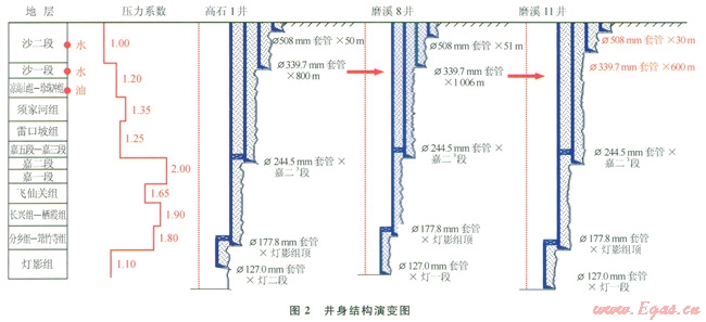 第二輪井的井身結構設計以地層3個壓力剖面為依據(jù),在充分分析地質條件后,對Æ339.7mm表層套管下深進行了合理調整至500~600m(圖2中的磨溪11井),縮短了Æ444.5mm井眼段進尺300~500m,確保Æ311.2mm井眼在鉆遇氣層后具備一定的井控能力,實施后的施工周期同比節(jié)約了6~7d。