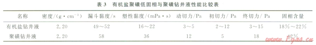 表3為有機鹽聚磺低同相與聚磺鉆井液性能比較數(shù)據(jù),采用有機鹽加重劑配制的有機鹽聚磺低固相鉆井液,與單獨采用重晶石加重配制的聚磺鉆井液配相比,其流變性更好,固相含量更低,有利于改善鉆頭研磨巖石的井底工作環(huán)境,提高機械鉆速。