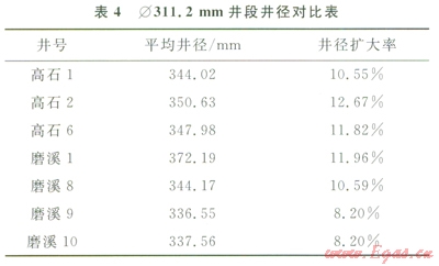 有機鹽鉆井液體系在高石2井、高石6井、磨溪8井、磨溪9井、磨溪l0井的Æ311.2mm井段和Æ215.9mm井段現(xiàn)場應用。表4為高石2、高石6、磨溪8、磨溪9、磨溪l0井Æ311.2mm井段應用有機鹽鉆井液的平均井徑對比數(shù)據(jù),轉換為有機鹽體系后的滾動回收率均提高,機械鉆速明顯提高,平均井徑擴大率明顯降低(表4),高石2井等井由于上部氣體鉆形成的大井徑,造成井徑擴大率偏高。
