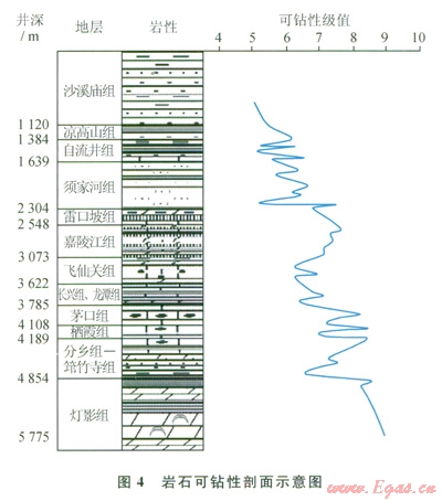 四川盆地深井—超深井鉆井提速一直是制約天然氣勘探開發(fā)的難題,氣體欠平衡鉆井、PDC鉆頭的應用一定程度提高了深井鉆井速度,但還不能滿足國家經濟發(fā)展對天然氣勘探開發(fā)的形勢和要求。而四川中部地區(qū)的樂山 龍女寺古隆起儲層埋藏深,垂直井深超過5000m,鉆遇地層類型多,巖性復雜,提高鉆井速度遇到以下4個方面的工程地質難點。