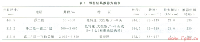 鉆井提速技術已經廣泛應用PDC鉆頭+螺桿鉆具的復合鉆井模式[2],螺桿的使用增加了井底鉆頭轉速從而大幅提高鉆井速度。但常規(guī)螺桿鉆具在大尺寸井段的扭矩不足,隨著井底溫度升高也會對螺桿定子橡膠產生影響[5-6],通過對不同井眼尺寸的螺桿鉆具應用試驗效果進行分析,推薦了螺桿鉆具應用的參數(shù)要求(表2),從而更好地與PDC鉆頭使用時間匹配: