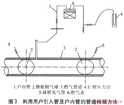 依照圖2的原理,筆者還研究出另外一種方法。具體做法是:先在有泄漏疑點的管段上鉆3個絲孔(兩側(cè)為裝球孔,中間是測壓孔,懷疑的泄漏點在兩個裝球孔之間),再將測壓膠管一端從測壓孔伸進兩球間的測漏管段中,然后再分別從兩個裝球孔各送入一個球,各自充氣封堵后使待測管段形成密閉空間。通過測壓膠管及U型壓力計可以知道被測管段壓力變化。如泄壓,還可以通過測壓膠管向密閉管段內(nèi)充氣(以氮氣等惰性氣體為宜)升壓,并觀察壓力變化。如此可進行反復(fù)試驗,直到確定泄漏點為止。如果測試中穩(wěn)壓較好,則可確認漏氣點不在兩球之間的管段,應(yīng)繼續(xù)如法鉆孔堵球查找。