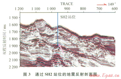 圖3是神狐海域過(guò)SH2站位的地震反射剖面,從圖3中可看出,沉積物波表現(xiàn)為席狀波狀相,整體呈長(zhǎng)條形或伸長(zhǎng)狀席狀外形,厚度較為均一,內(nèi)部同相軸呈不對(duì)稱波狀反射結(jié)構(gòu),向上坡方向遷移攀升;在橫切大陸坡的剖面上,呈連續(xù)的波狀或丘狀;其底部有明顯的滑脫面,這是由于底流發(fā)育時(shí)具有較強(qiáng)的侵蝕能力,對(duì)早期的沉積物進(jìn)行了簸選改造和再沉積,頻繁的侵蝕界面可能反映r底流的脈動(dòng)性。剖面上TRACE900~TRACEl 000,BSR之上有一明顯的因速度振幅異常而形成的眼球狀結(jié)構(gòu),是一條比較典型的含水合物層特征的地震剖面。另外,BSR上面有明顯的、連續(xù)性較好的振幅空白帶,極性與海底極性相反。