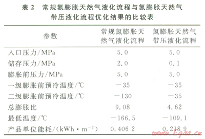 經(jīng)過模擬和優(yōu)化計算,表2列出了常規(guī)氮膨脹天然氣液化流程和氮膨脹天然氣帶壓液化流程的優(yōu)化結(jié)果。比較可知,二者的最優(yōu)入口壓力、膨脹前壓力和預(yù)冷溫度是相同的。由此可見,和常規(guī)氮膨脹流程相比,氮膨脹天然氣帶壓液化流程具有以下優(yōu)點(diǎn):①膨脹比降低,約為前者的一半;②最低溫度為-l66℃,比前者提高了約56℃;③產(chǎn)品LNG單位能耗僅為0.2189kwh/m3,相較前者的0.4062kwh/m3降低了約46%;④此外,膨脹比的降低使其可以省去一個壓縮膨脹機(jī)組,使流程結(jié)構(gòu)更簡單,占地面積更小,并且使流程設(shè)備更少,初投資更低。