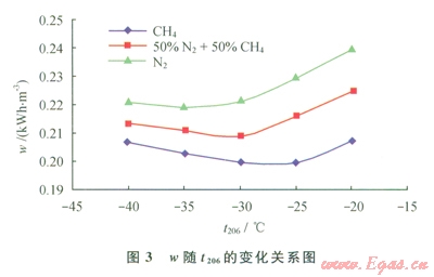 當(dāng)進(jìn)口天然氣壓力(P101)為5MPa、LNG儲存壓力(P104)為2MPa、氣體制冷劑膨脹前壓力(P204)為5MPa時,在一定范圍內(nèi)改變氣體制冷劑膨脹前預(yù)冷溫度(t206),通過HYSYS軟件模擬計算可得到產(chǎn)品LNG的單位能耗(w),進(jìn)而得到w隨t206的變化關(guān)系(圖3)。由圖3可知,產(chǎn)品LNG單位能耗先隨制冷劑膨脹前預(yù)冷溫度的增加而降低,后又隨之增加而增加。這是因?yàn)榕蛎浨皽囟容^低時,流程的熱負(fù)荷較大,造成制冷劑流量上升,壓縮機(jī)功耗隨之增加,從而導(dǎo)致產(chǎn)品LNG能耗增加。膨脹前溫度較高時,膨脹后的溫度也較高,引起膨脹后壓力自調(diào)節(jié)降低壓力,壓縮機(jī)功耗隨之增加,從而導(dǎo)致產(chǎn)品LNG能耗增加。故而制冷劑存在一個最優(yōu)膨脹前壓力,南圖3可知,t206為-25℃、-30℃、-35℃時分別是CH4、50%N2+50%CH4、N2制冷劑的最優(yōu)膨脹前預(yù)冷溫度。