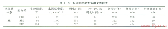同井形成的水泥環(huán)需要滿足不同氣田的地質(zhì)條件對(duì)力學(xué)性能及界面膠結(jié)性能的要求,各個(gè)油氣田做了大量研究試驗(yàn)工作[10],在該氣田采用了SD系列固井水泥添加劑,該體系使水泥漿具有很好的直角稠化性能,在水泥漿從液態(tài)轉(zhuǎn)為固態(tài)的過(guò)渡階段,地層流體在環(huán)空形成竄流的風(fēng)險(xiǎn)大大降低(圖2、表l)。