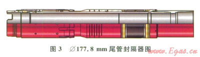 地層易漏和發(fā)生氣竄風(fēng)險(xiǎn)較高的固井施工,采用帶有管外封隔器的固井工具。Æl77.8mm尾管固井施工中,使用帶有管外封隔器的尾管懸掛器(圖3)。頂替水泥漿過(guò)程結(jié)束后,座封管外封隔器,在Æ177.8mm尾管與上層Æ244.5mm套管之間的環(huán)空實(shí)現(xiàn)完全封隔,循環(huán)洗井過(guò)程增加的壓力無(wú)法傳遞到裸眼段,同時(shí)還可阻止地層流體進(jìn)入封隔器以上的Æ244.5mm套管。
